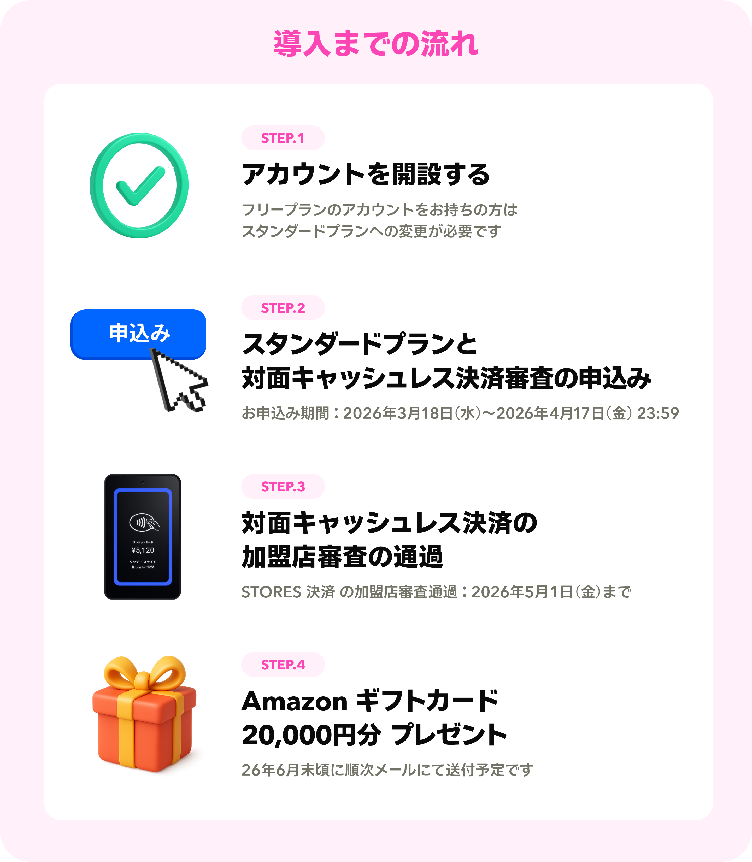 - 2026年5月1日(金)までに、対面キャッシュレス決済の加盟店審査を通過すること