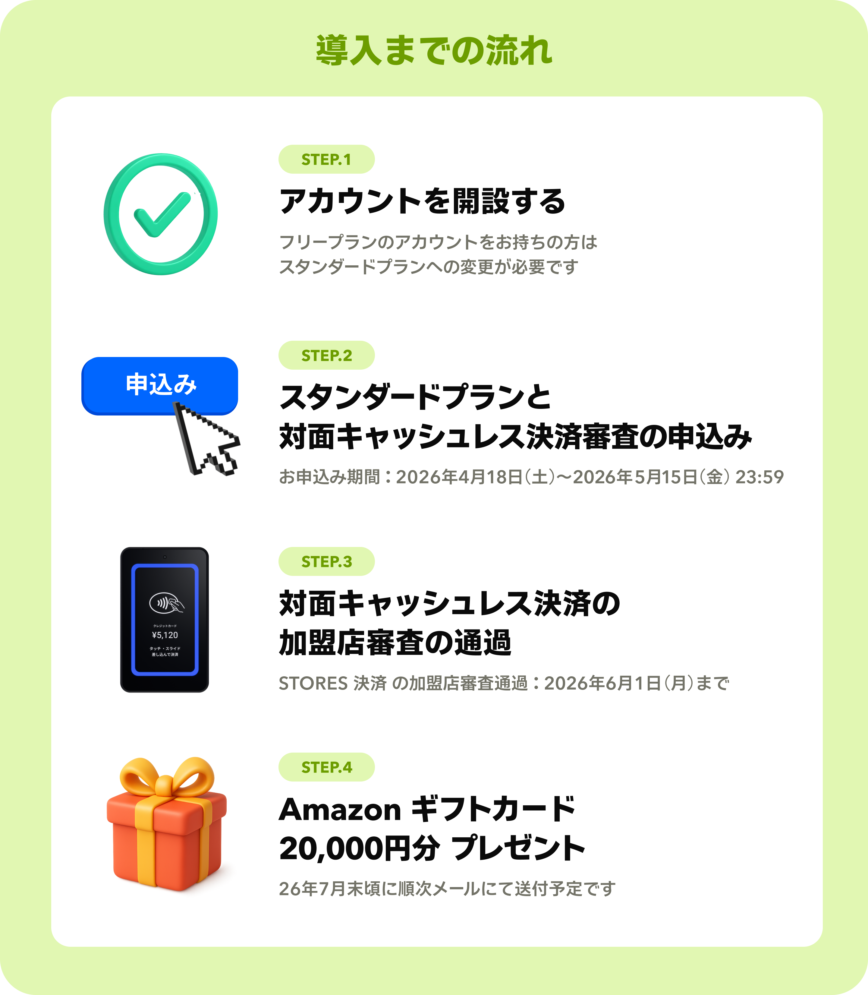 - スタンダードプランをお申し込みいただいても、2026年6月1日までに対面キャッシュレス決済の加盟店審査を通過しなかった場合はキャンペーン対象外となります
