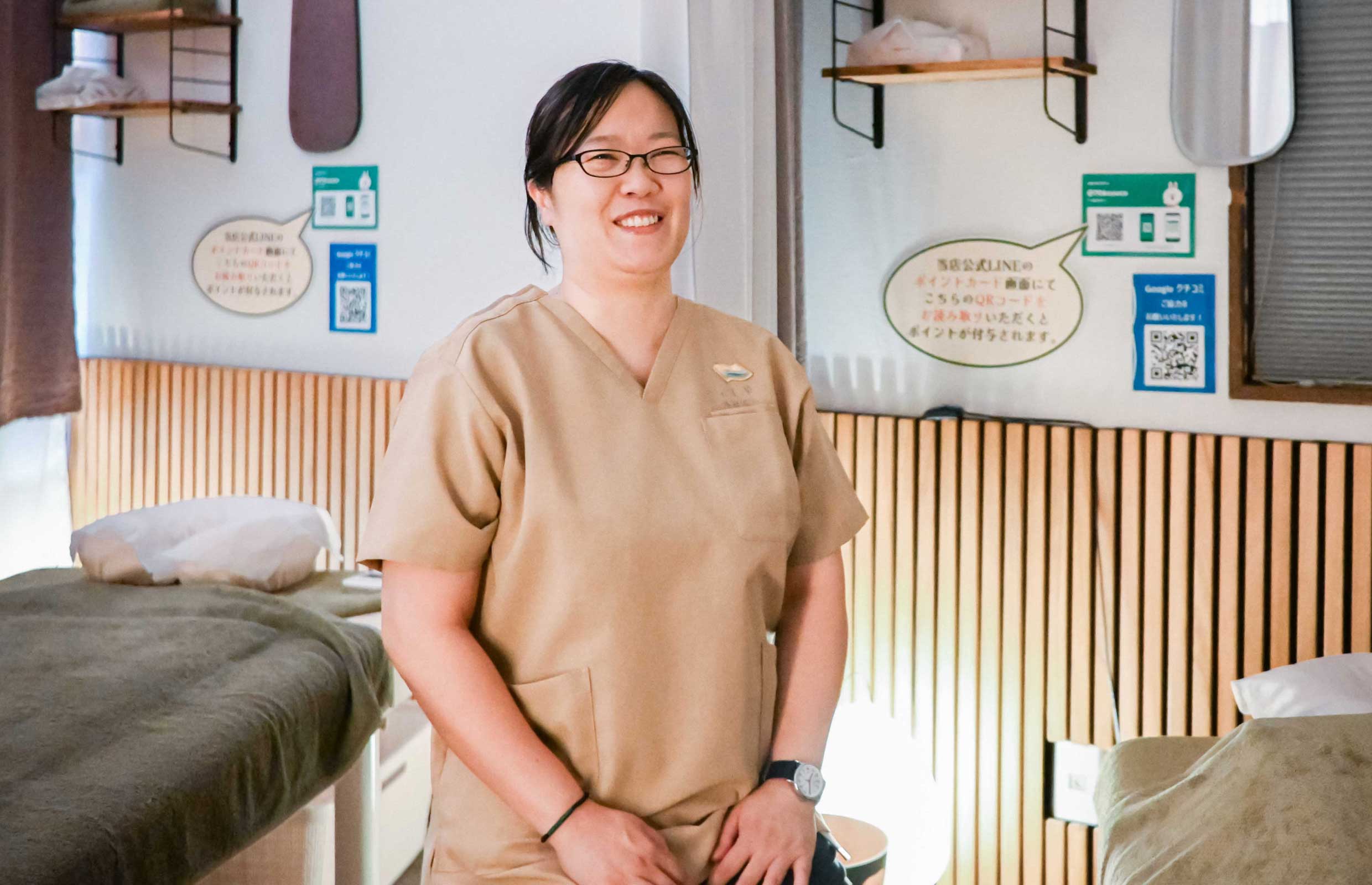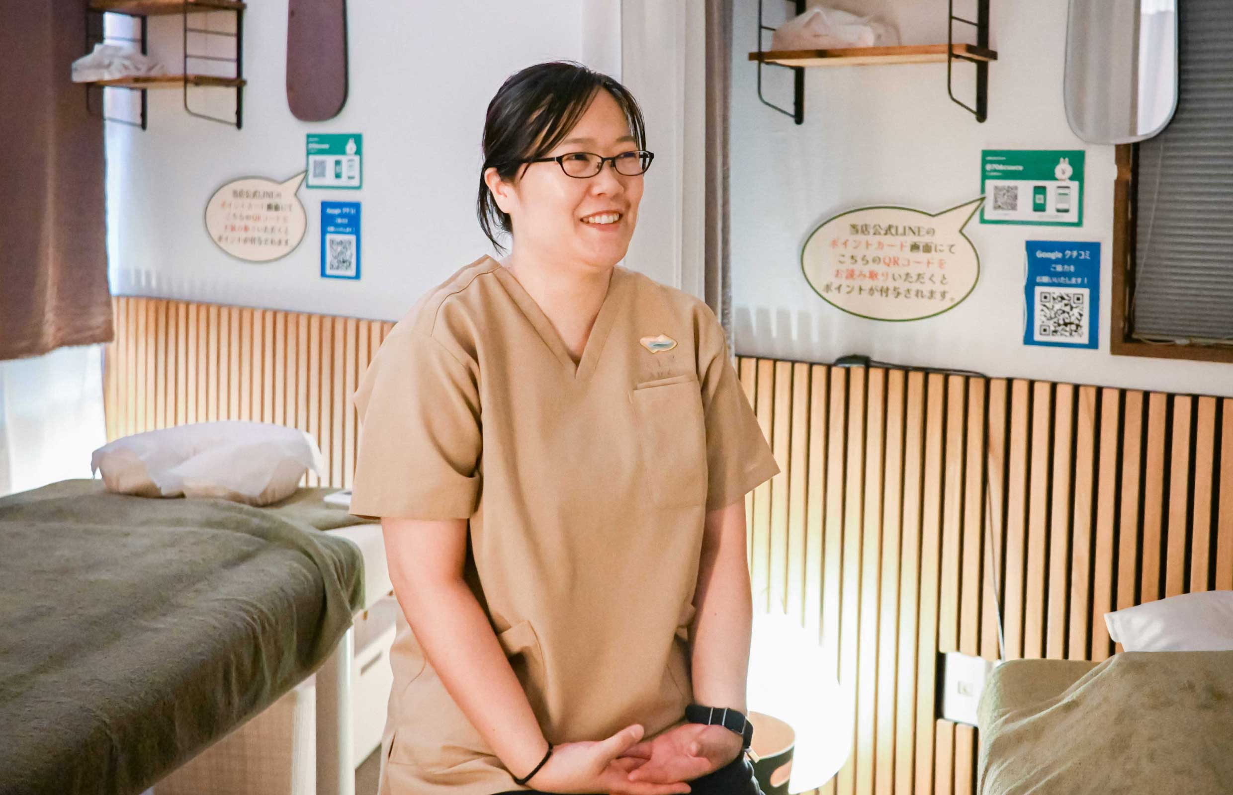 こし楽では、マッサージだけでなく、お客さまの心身をともに癒すことを大切にしています。だからこそ、1回1回の施術を通して、「ふっ」と体の力が抜けるようなコミュニケーションや空間づくりを心がけています。これからも、この積み重ねで「またここに来たい」というお客さまが1人でも多く増えていくと嬉しいですね。
