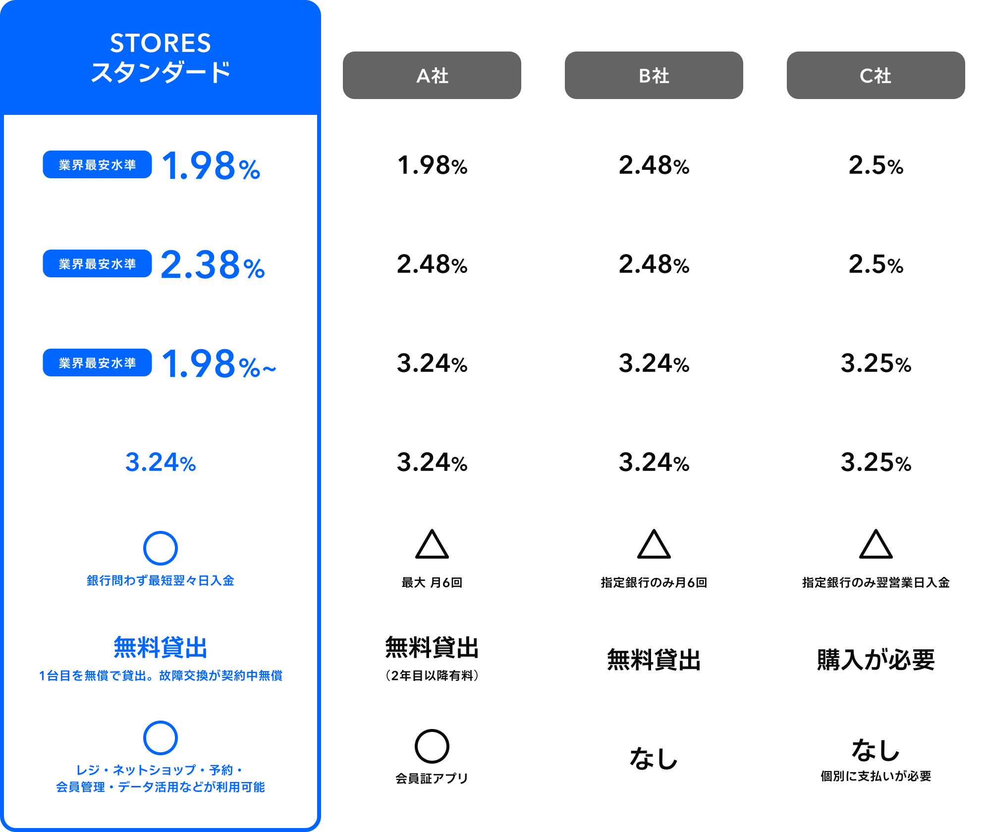 他社と比べても、決済手数料はもちろん、POSレジとセットでソフトウエア費を軽減!